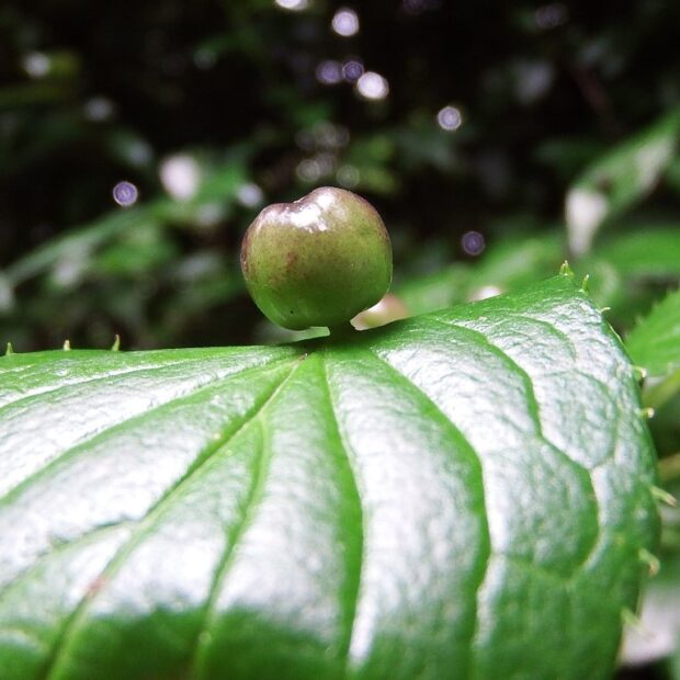 花や実が葉の真ん中に付いているのがユニークです。 名前も、 花の咲く様子を「花が乗った筏」に見立てて名付けられました。