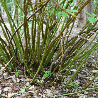 古い幹は黒っぽい樹皮で、 新しい幹や枝は緑色か紫色を帯びています。