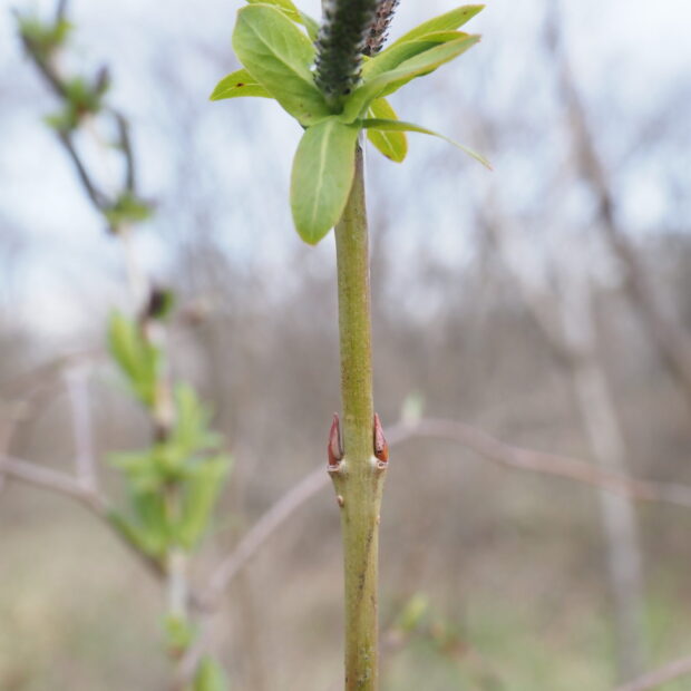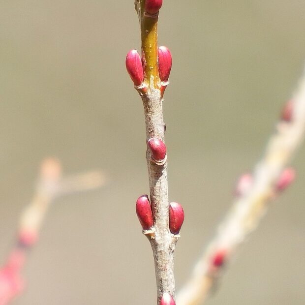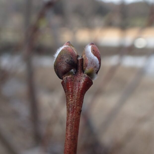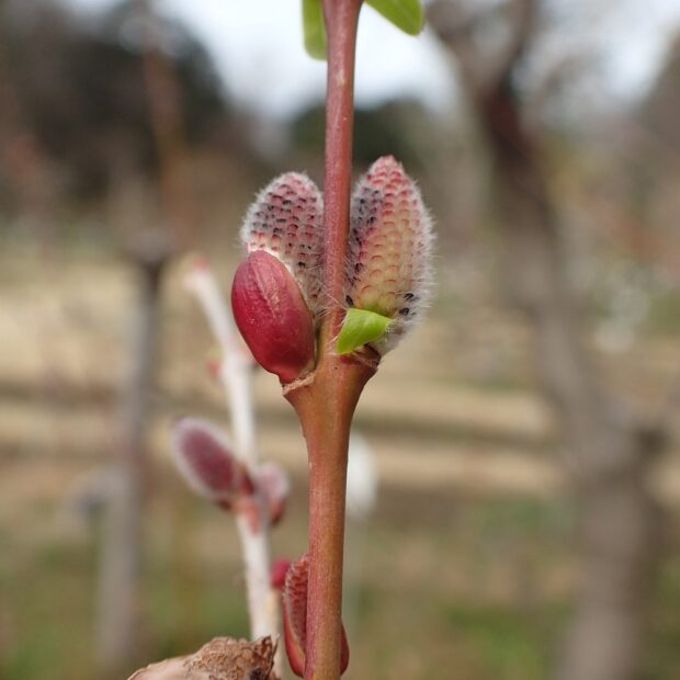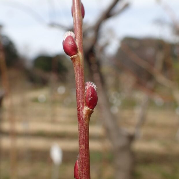 卵形でつやつやの赤紫色のカバー(芽鱗)に包まれた冬芽が付きます。 春になると中からふさふさした新芽の白い毛がはみ出て来ます。