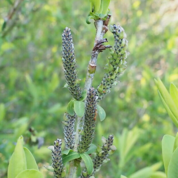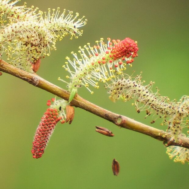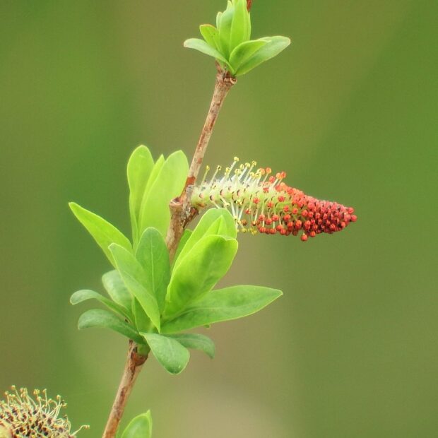 春、 雄花と雌花が別々の木に咲きます。 花はそれぞれ雄しべと雌しべの集まりで、 長さ2㎝ほどの円柱状になります。