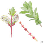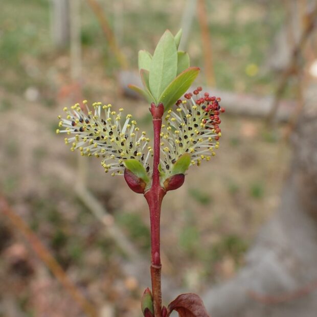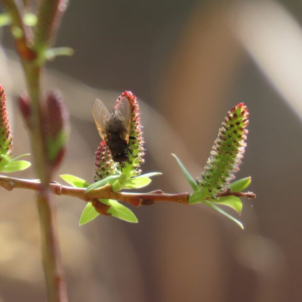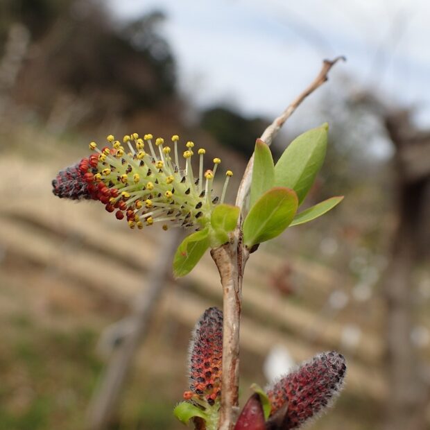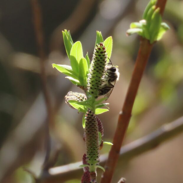 花には成虫で越冬した小さな虫たちがやって来ます。 葉に食べあとがあれば、 ヤナギルリハムシの幼虫や成虫が見つかるかも?
