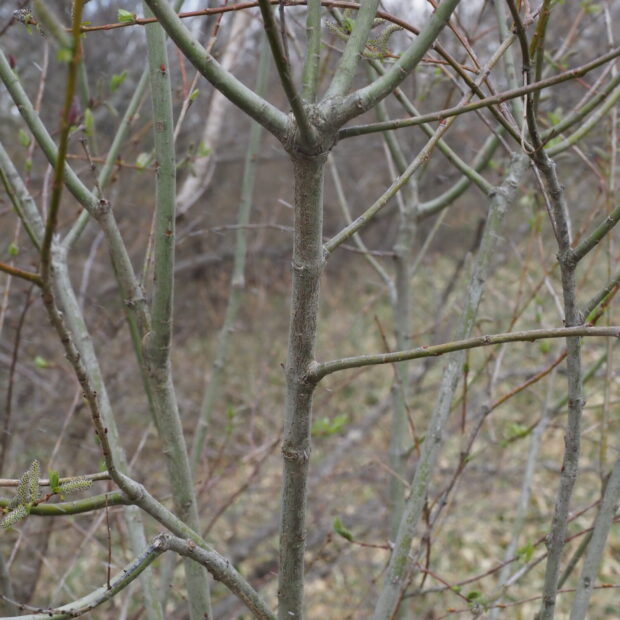 若い枝は赤味がかったり、 黄色がかった茶色で、 生長するに連れて灰色でなめらかな樹皮になります。