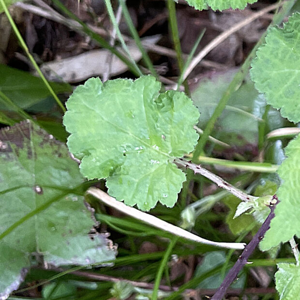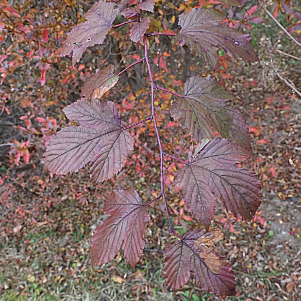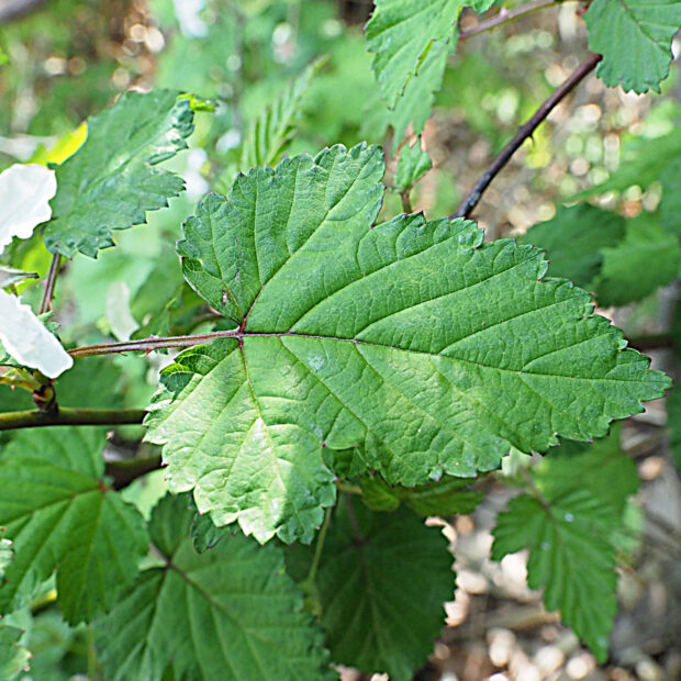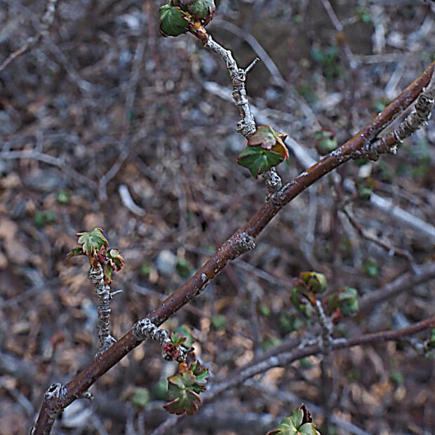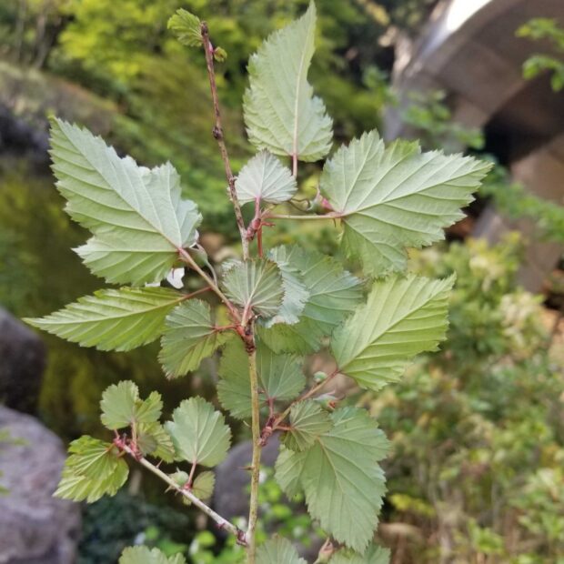 ふつう三つに裂ける葉っぱを付けますが、 裂けずに広い卵形をしている葉っぱもあります。 花がつく枝には小さめで丸い楕円形の葉が付くことが多いです。