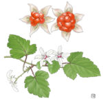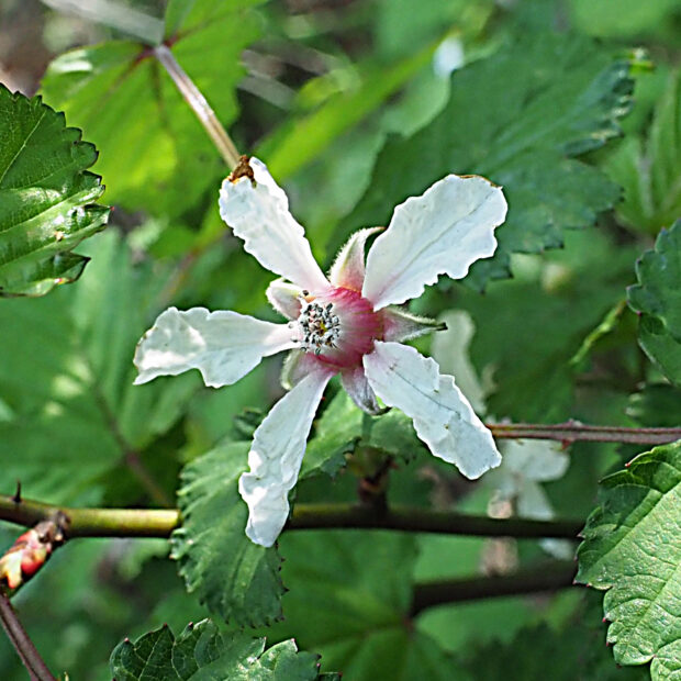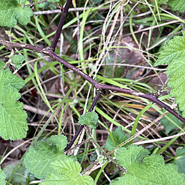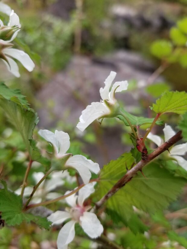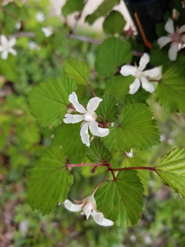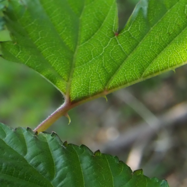 茎や葉柄には鋭いトゲがたくさんあり、 可愛いながらも小悪魔的な印象を持つキイチゴちゃんです。