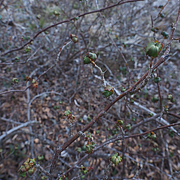 幹や枝には細いトゲがたくさんあります。 しばしば粉をふいたような白い部分があります。
