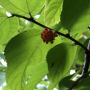 ・カジノキの葉も似ていますが、 カジノキは対生する枝がよく混じっていて、 枝に粗い毛が多く灰色がかった樹皮であることが見分けるポイントになります。