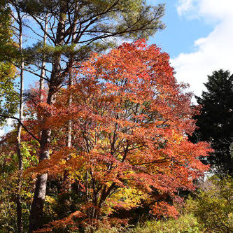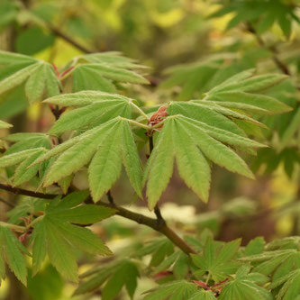 ハウチワカエデの小型版で、 天狗の持っている羽団扇(はうちわ・羽でできた団扇)に似た形の葉っぱを付けます。 ハウチワカエデよりも暑さに強く、 初夏に咲く淡い黄色の花は目立ちにくく、 おとなしめな印象です。 もちろん!秋の紅葉はとても美しく見応えがあります。