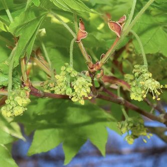 初夏、 淡い黄色の雄花と両性花が混じって咲きます。 白い綿毛があり、 他のカエデとの見分けるポイントになります。