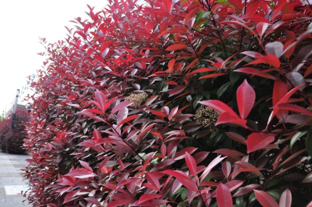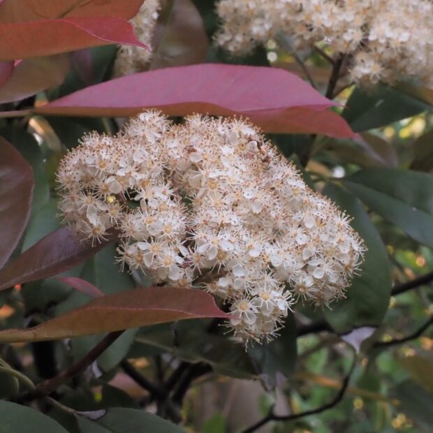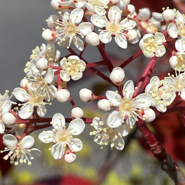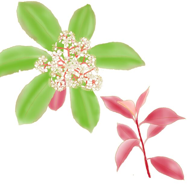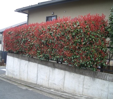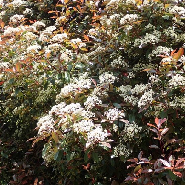 春の芽吹きが真っ赤で花が咲いたようです。 特に街中によく植えられるレッドロビンという品種は真っ赤なので良く目立ちます。 真っ赤な芽吹きの時期が終わるとすぐに白い花が木全体に咲きます。