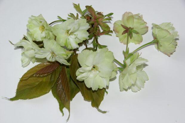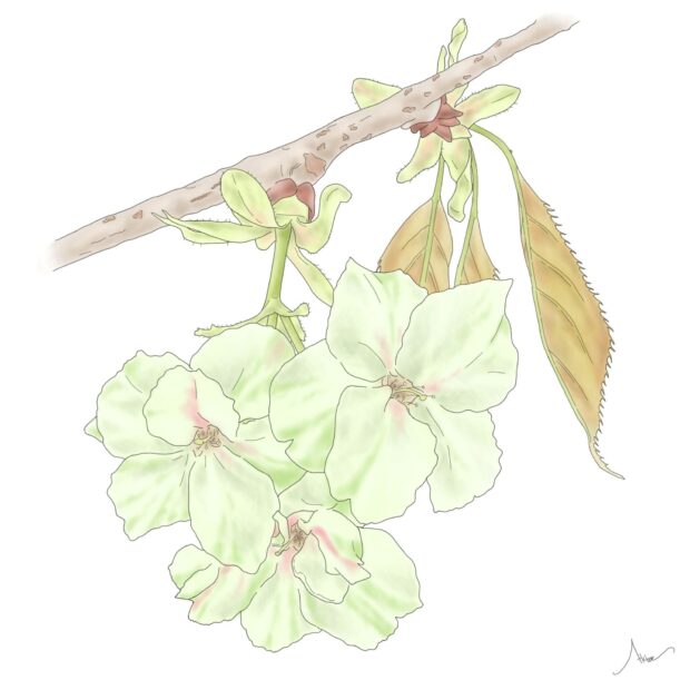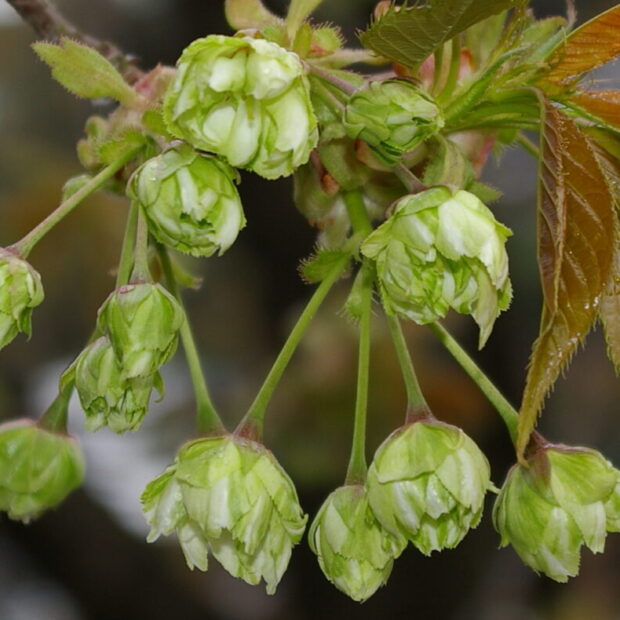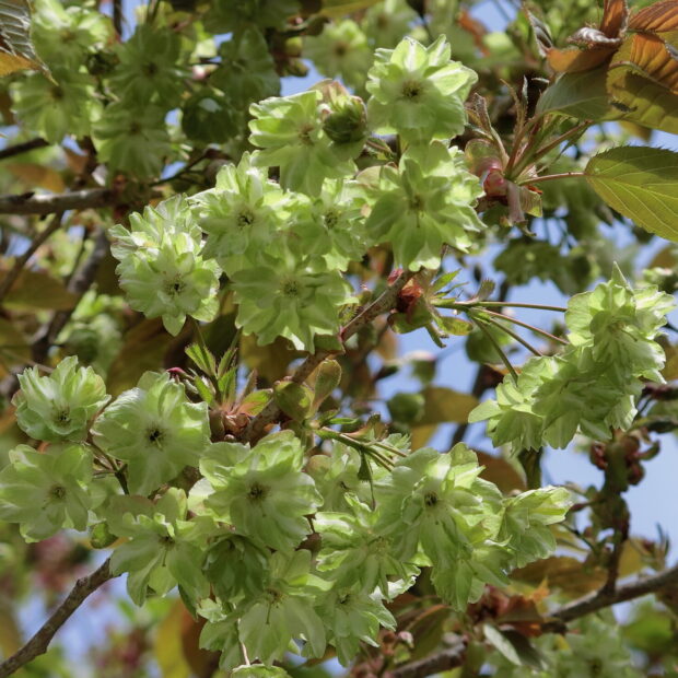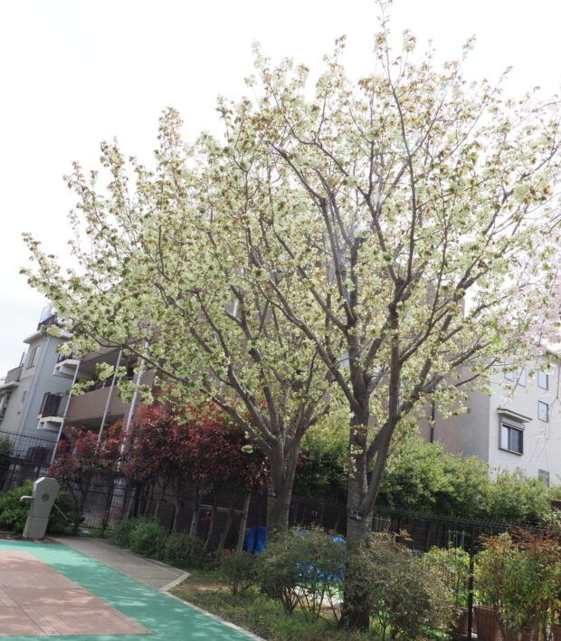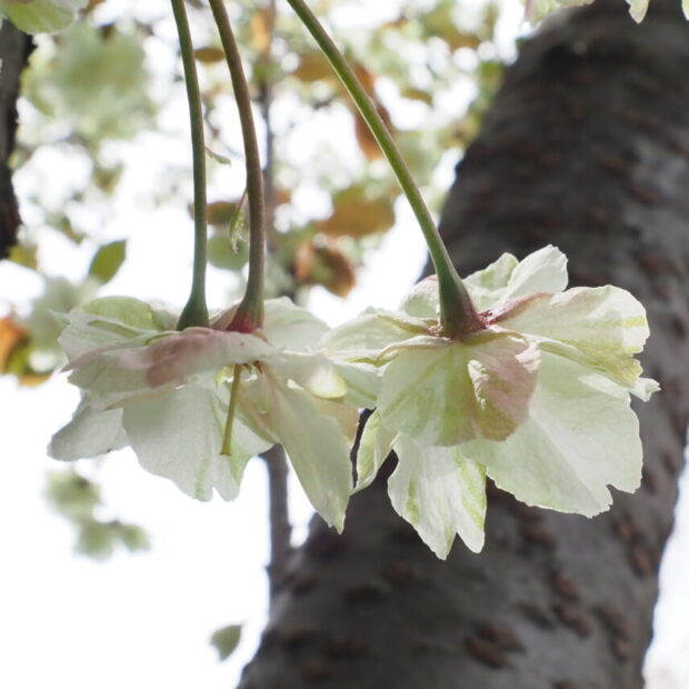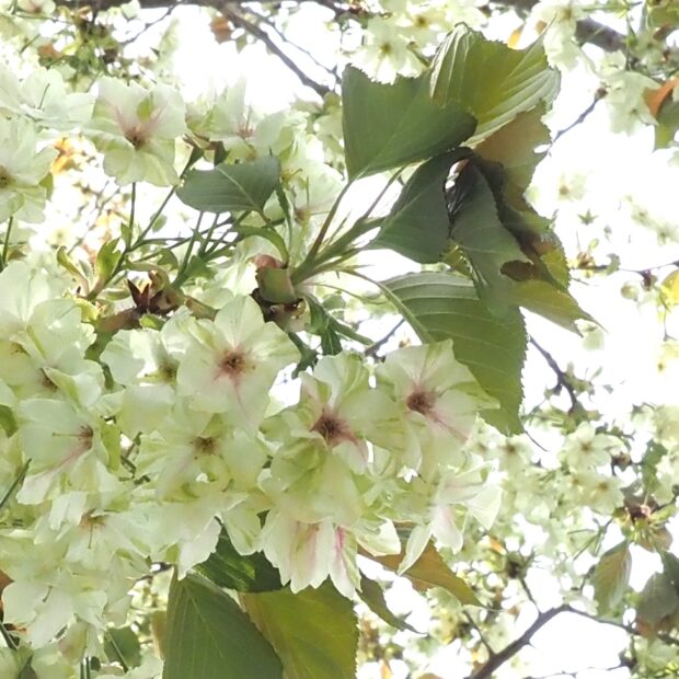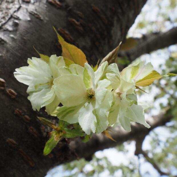 花びらが緑っぽいサクラです。 緑色の花は元々葉から進化したことを証明する祖先帰りの現れです。 時折、 花びらにみどりの線が現れるウコンの「枝変わり」だといわれ、 ウコンのようにクリーム色の花が咲くこともあります。 花は時間がたつと赤味がさし、 色が変わります。