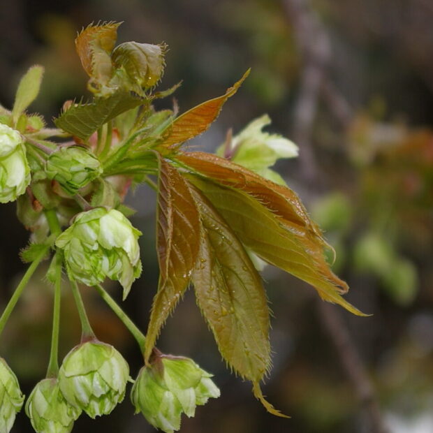 楕円形でギザギザは細かく、 葉先は尾のように尖ります。 花と同時に出る新芽は赤茶色をしています。