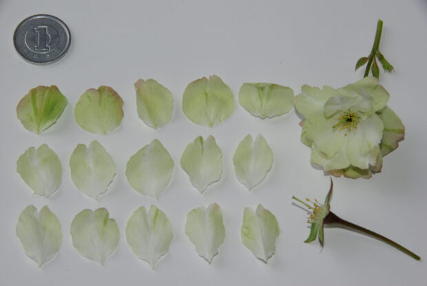 花びらの緑の部分の裏側には気孔があり、 緑の色は葉緑素という色素です。
