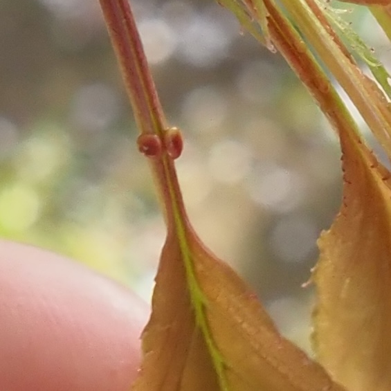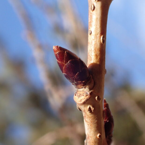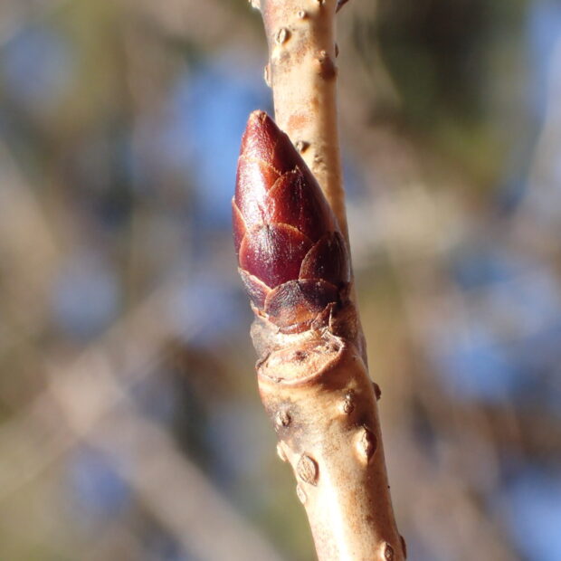 赤くぷっくりとした水滴型の冬芽です。 葉痕の維管束痕は3個。 花が咲いていなくても、 お顔を楽しみましょう。 褐色で少し光沢があります。
