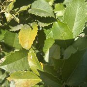 ヘリグロテントウノミハムシは、 黒いはねに2個の赤い紋がありテントウムシにそっくり!幼虫も成虫も葉を食べるので、 葉は食べあとだらけになります。