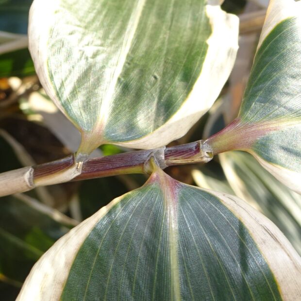 白い縁取りと中央の緑のコントラストが美しいので庭木として用いられ、 庭園でよく見かけます。