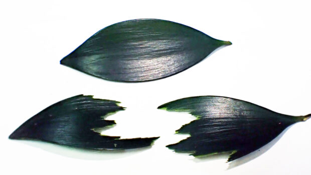 ナギの葉はなかなかちぎれないので、 「チカラシバ」「恋つなぎ」などと呼ばれ恋愛のご利益が期待されます。 葉を力をこめてちぎってみると、 ギザギザに切れて、 いたいたしい失恋のよう(葉っぱと実際の恋愛とは関係はありません)。 葉っぱをちぎれ方を観察してみましょう。
