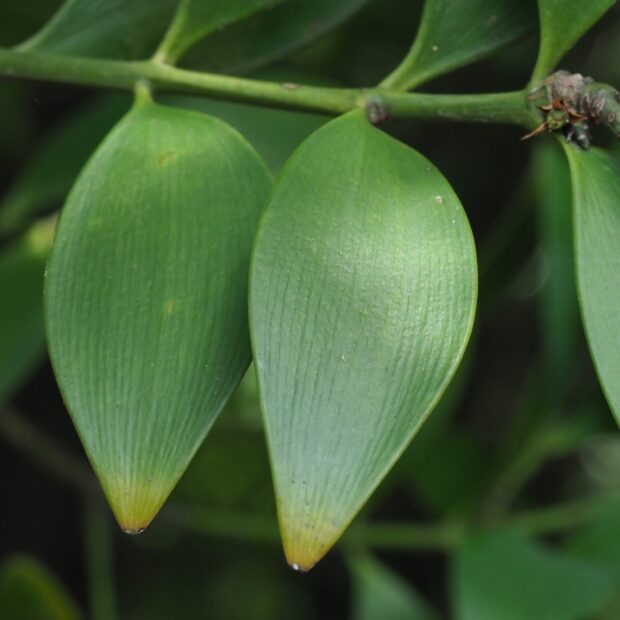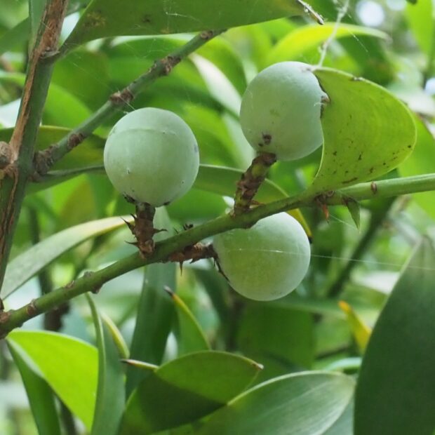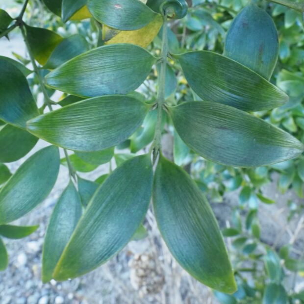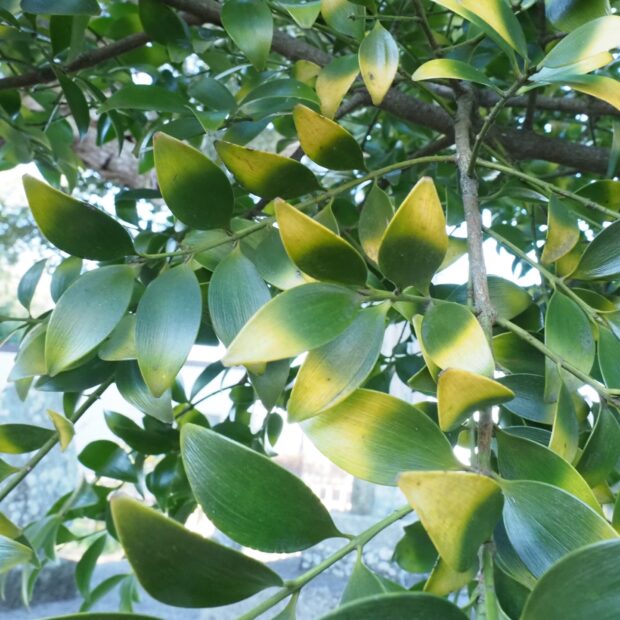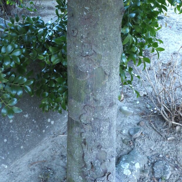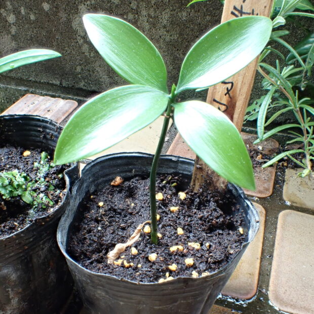 ナギは針葉樹の仲間ですが、 広い葉を持ちあまり針葉樹っぽくありません。 葉ははっきりとした葉脈がなくて、 のっっぺりしていて雰囲気があります。 ナギは縁結びなどのご利益があると、 「恋つナギ」と神社などに植えられます。 寒いのは苦手で、 関東ではちょっと寒そうにしています。