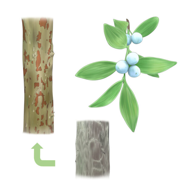 樹皮は黒褐色、 平滑で外皮が薄片にはげます。 小枝は緑色で無毛です。