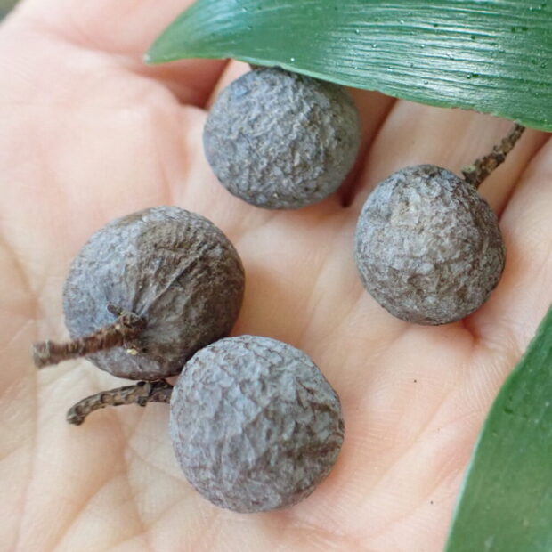 球形で直径15mm。 表面は白粉を帯び、 青白色です。