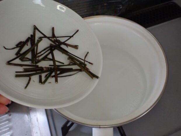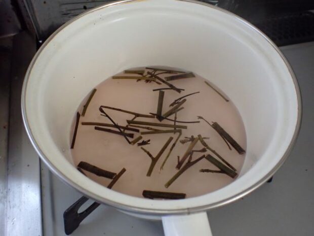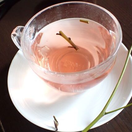 クロモジの枝でお茶を作ることができます。 ほんのりピンクのお茶はさわやかな香りがあります。