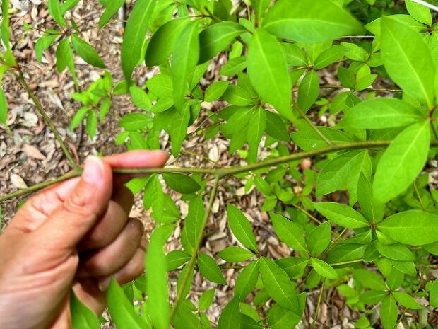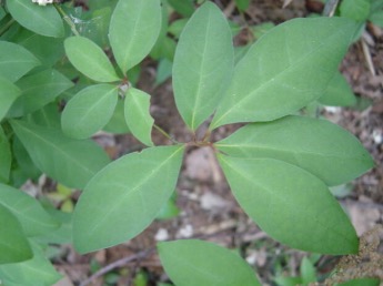 薄い葉っぱで、 光がすけます。 ギザギザがなくて長丸の形をしています。 葉の長さは5~10㎝で、 交互につきます。