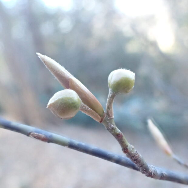 春、 丸い花芽から小さな花が咲きます。 雄雌別々の木で、 どちらかというと雄株が多いようです。