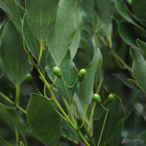 花も実も小さくて目立たない木なので、 その辺の普通の木に見えますが、 枝葉、 特に根っこはシナモンの良い香りがします。 今は中国やインドのシナモンを使うことが多いのですが、 昔は人気のおやつでした。