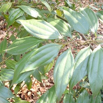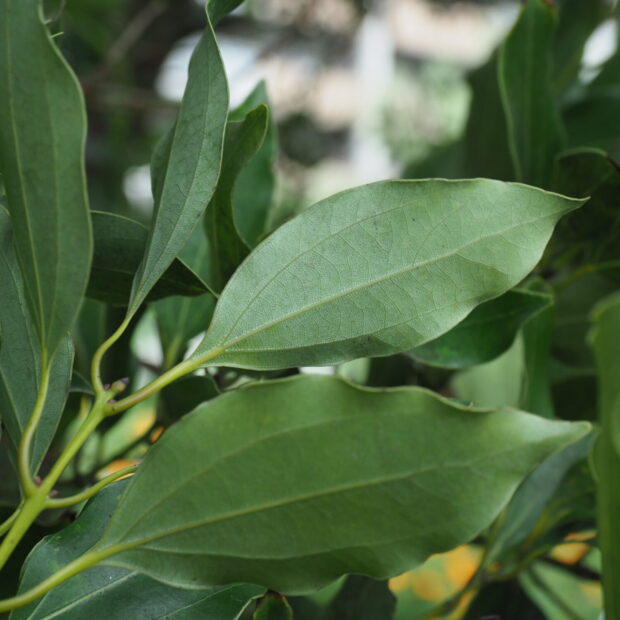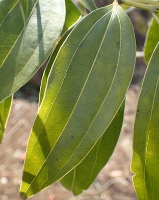 葉の長さは10~15㎝ぐらいで、 ギザギザはなくのっぺりした葉。 葉脈は3つに分かれて葉裏は短い毛が生えています。 葉の柄をかじるとシナモンの香りがします。