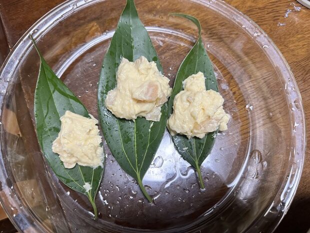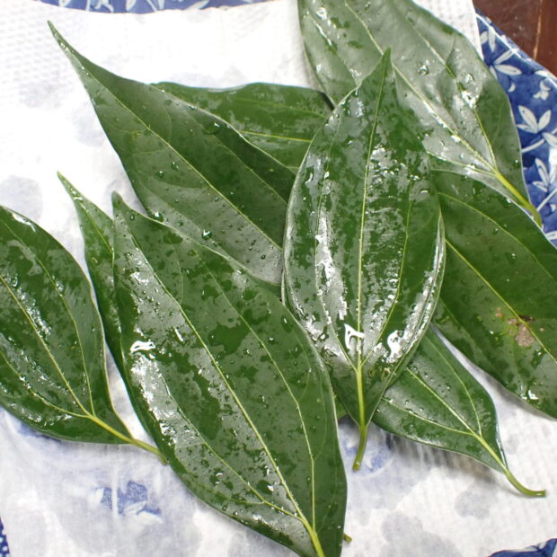 昔は薬として利用されていましたが、 その後昭和まで駄菓子などのおやつとして親しまれました。 九州の人から「遠足の前日はニッケイの根っこを掘っておやつに持って行った。 」と聞きました。 ガチの根っこを洗ってかじると甘くて辛くてシナモンの香り、 見かけも味も刺激的なおやつです。 鹿児島にはけせん団子というニッケイの葉でくるんだ饅頭があり、 シナモンの香りがほんのりします。