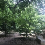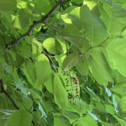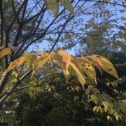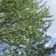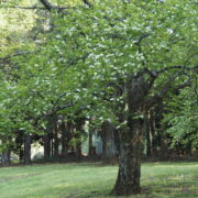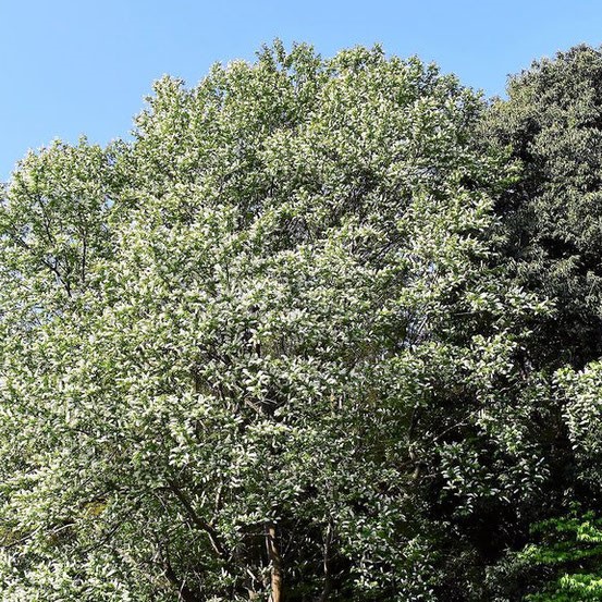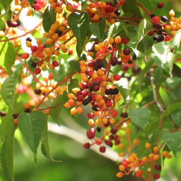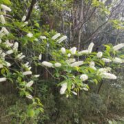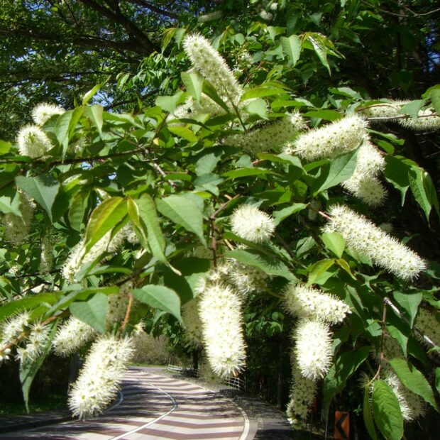 春にブラシ状の白い花を木にいっぱい咲かせる大きな木です。 夏の終わりにはカラフルな実もなります。