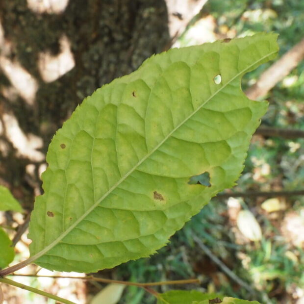 葉の先が少し尖っています。 葉の裏の脈が亀の甲のような模様に見えるのが特徴です。