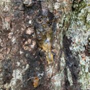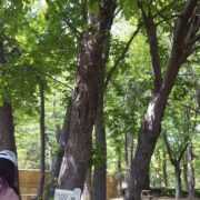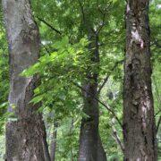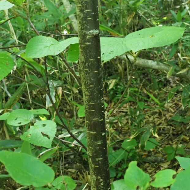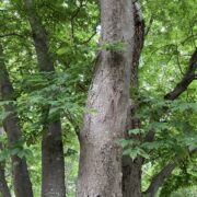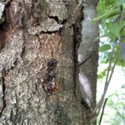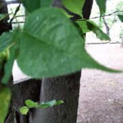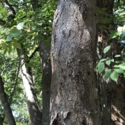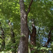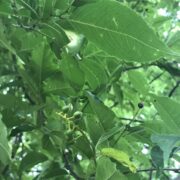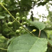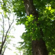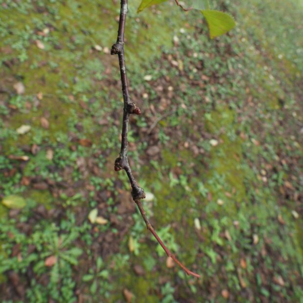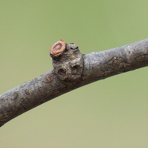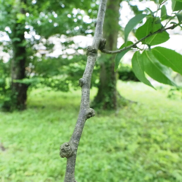 側枝(葉がついていた細い枝)が落ちた後が枝に残るのがウワミズザクラの特徴です。 これを落枝痕(らくしこん)と呼びます。