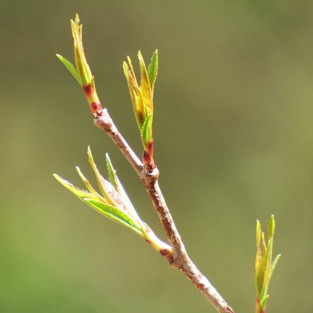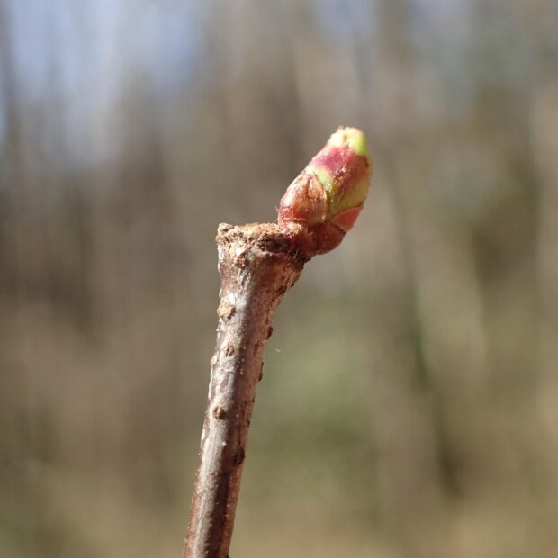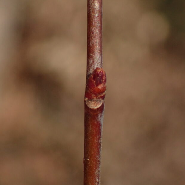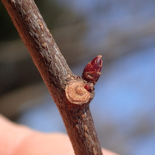 丸い落枝痕(らくしこん=側枝が落ちた痕)の脇につく赤い冬芽があったら、 ウワミズザクラである目印です。 新しく伸びた枝では、 半円形の葉痕の上に普通に冬芽がつきます。