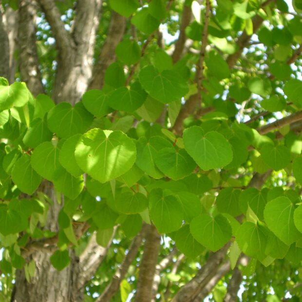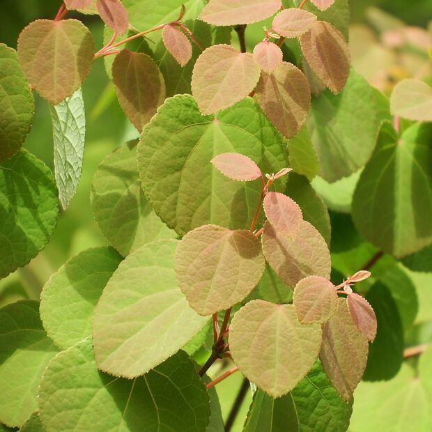 丸みのある葉っぱが向かい合ってつきます。 ハート型の葉が多いですが、 色んな形があります。 春の新緑、 秋の黄葉がとてもきれいです。 若葉や落ち葉はキャラメルのような甘い香りがします。