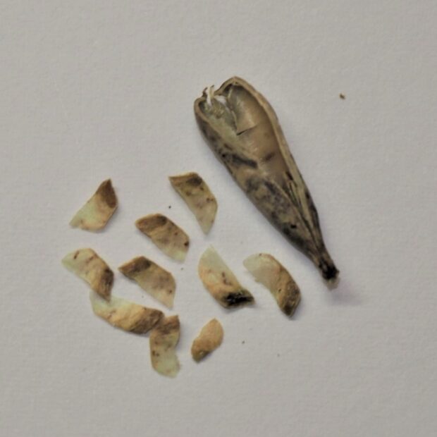 とっても小さな黒っぽいバナナのような実がなります。 中には小さな羽のついた種が沢山入っています。