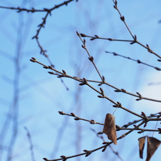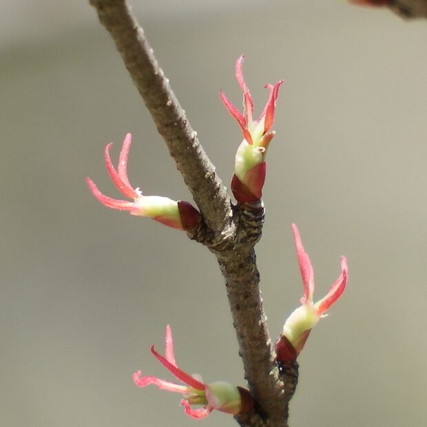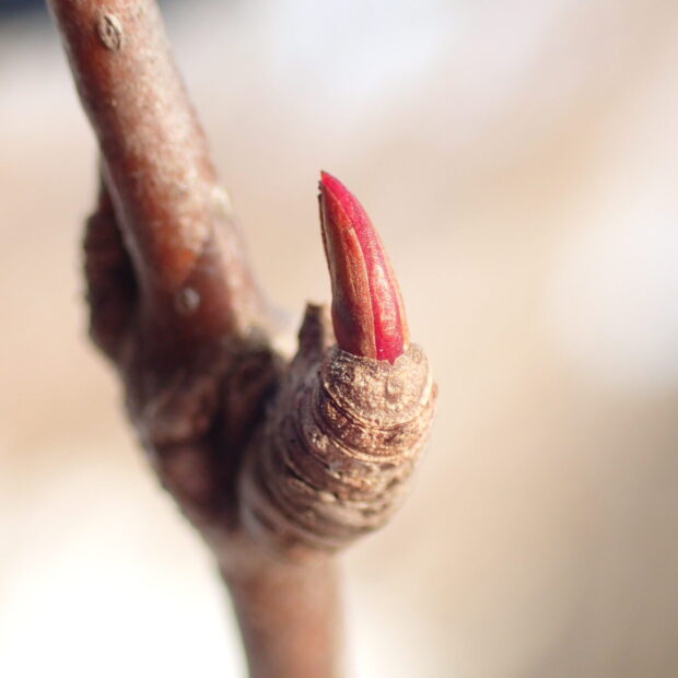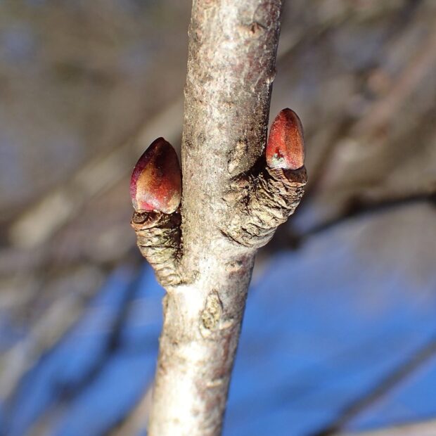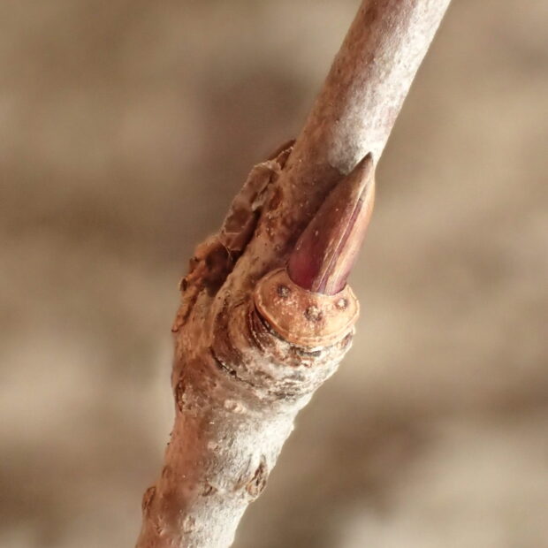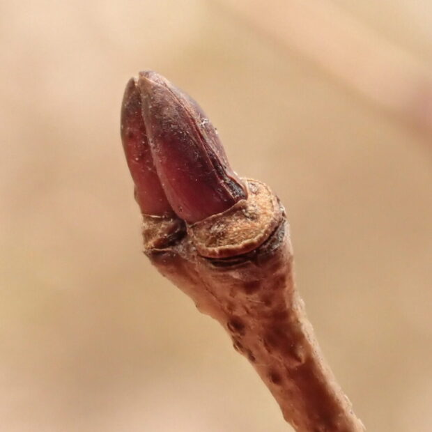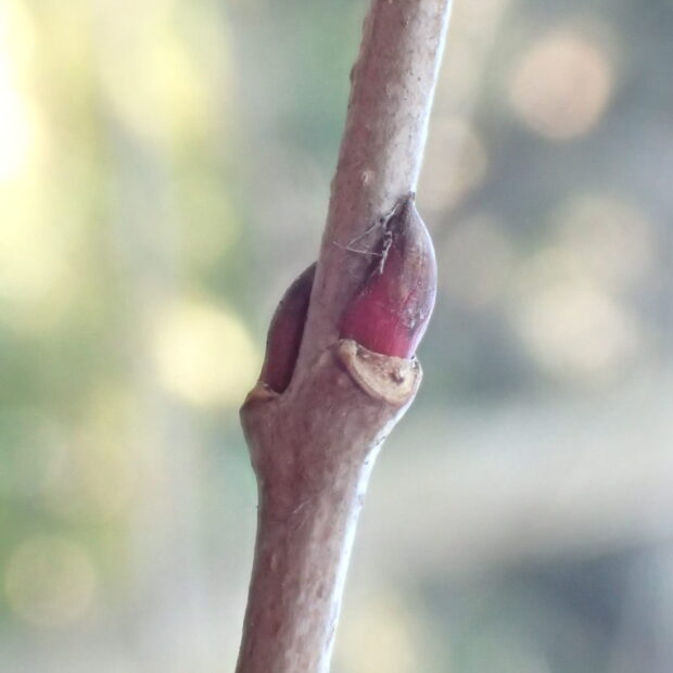 赤みがあって先のとがった冬芽で、 枝の両側に2個ずつ出ています。 葉痕の維管束痕は3つで、 烏帽子をかぶった平安貴族のようなお顔に見えます。 枝によって役割分担があり、 枝や芽のつき方が特徴的です。