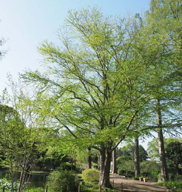 秋に黄葉する丸い葉っぱが特徴です。 落ち葉はキャラメルのようなあまい香りがします。 水辺を好みます。