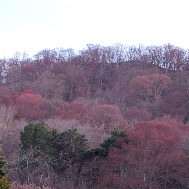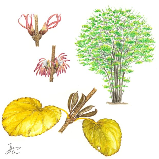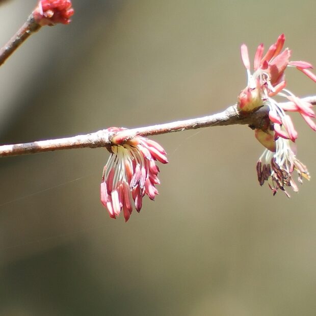 雄の木と雌の木があります。 花は地味ですが、 木全体に咲くので目立ちます。 北海道には山全体がカツラの花で赤く染まって見えます。