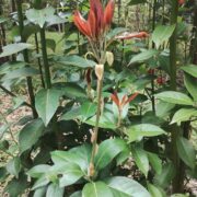 先がとがり、 スリムな卵型の芽です。 赤い芽鱗が何枚も重なっているのが見えます。