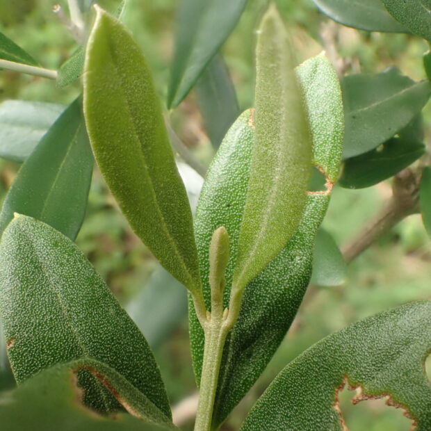 枝先、 葉のつけ根に、 白っぽいホワホワの毛でおおわれた小さな芽がつきます。 そのまま伸びて葉になります。