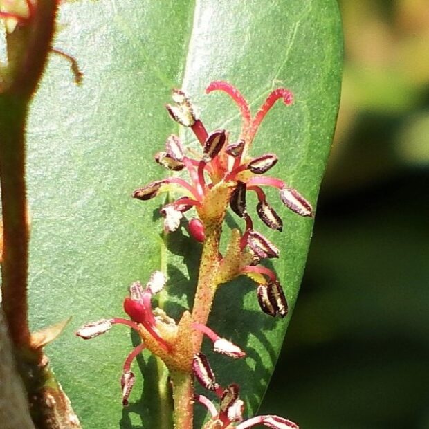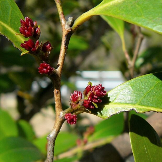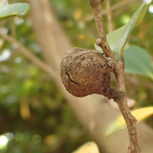 イスノキは関東以西の木。 九州や四国など暖かい地域で見られます。 葉の虫こぶが個性的と思われていますが、 じつは中身の木材がすごい木です。 重くて硬くて丈夫な木材は、 木刀から家具や楽器、 フローリングまで利用されます。