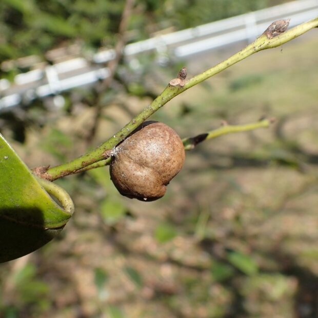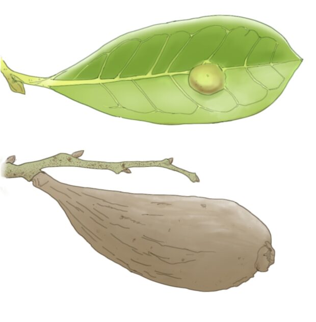 夏の終りから秋にかけて、 先がとがった実がなります。 この実も虫こぶになるといろんな形になります。