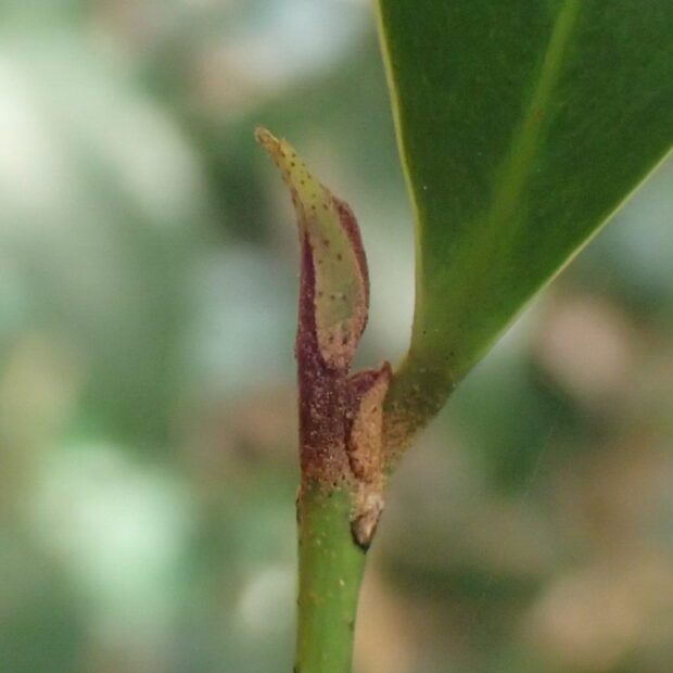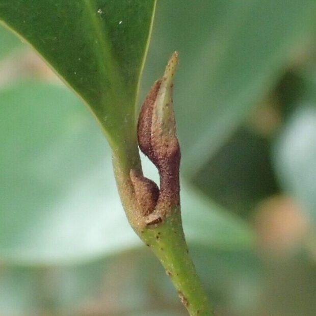 先がヒュンととがり、 茶色い毛のある芽です。 初めは托葉という小さな葉のようなものに挟まれていますが、 それはすぐに落ちてしまいます。