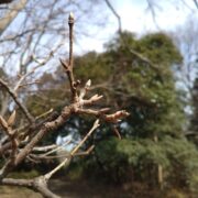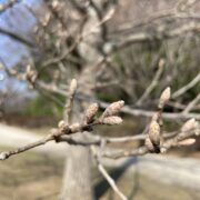たくさんの茶色い芽鱗がきっちりと並んでいます。 よく見ると、 うっすらと白い毛におおわれて守られていてあったかそうです。 少し角ばっていて、 上から見ると五角形です。