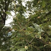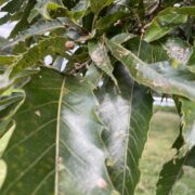 クヌギは虫たちに大人気の木。 葉は虫の食べあとだらけ。 葉を食べている犯人を捜してみましょう。