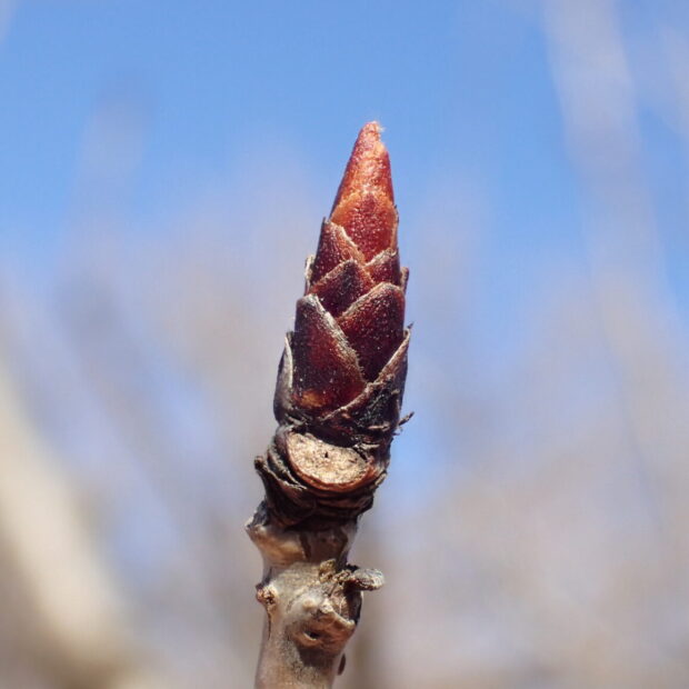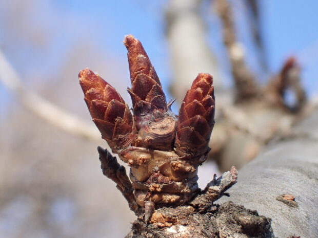 褐色で少し光沢があり、 少しだけ開き気味の芽鱗には毛がありません。 葉痕の維管束痕は3つでお顔に見えます。