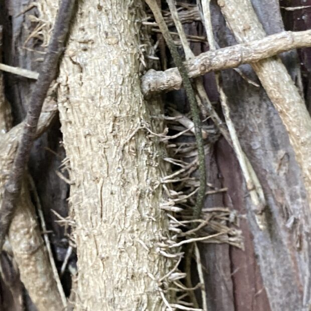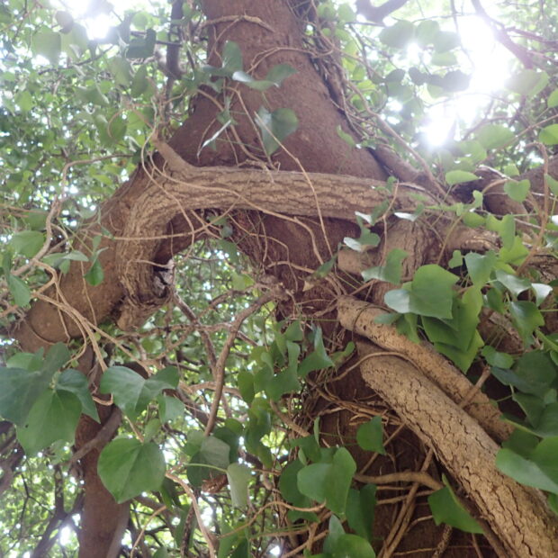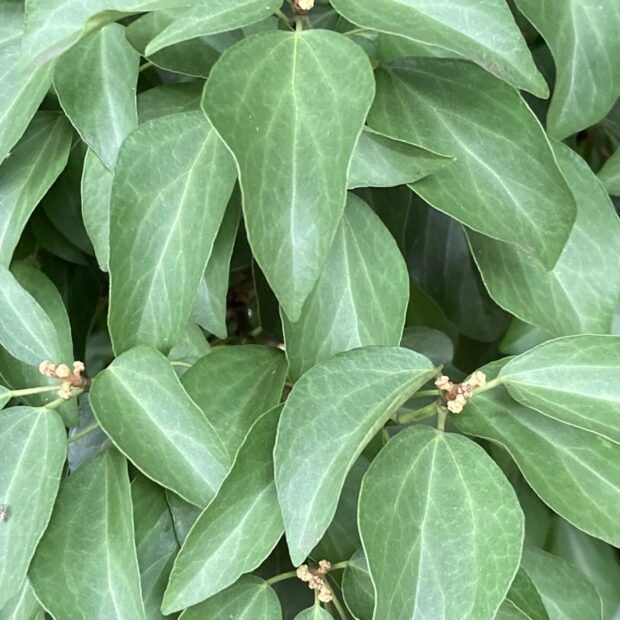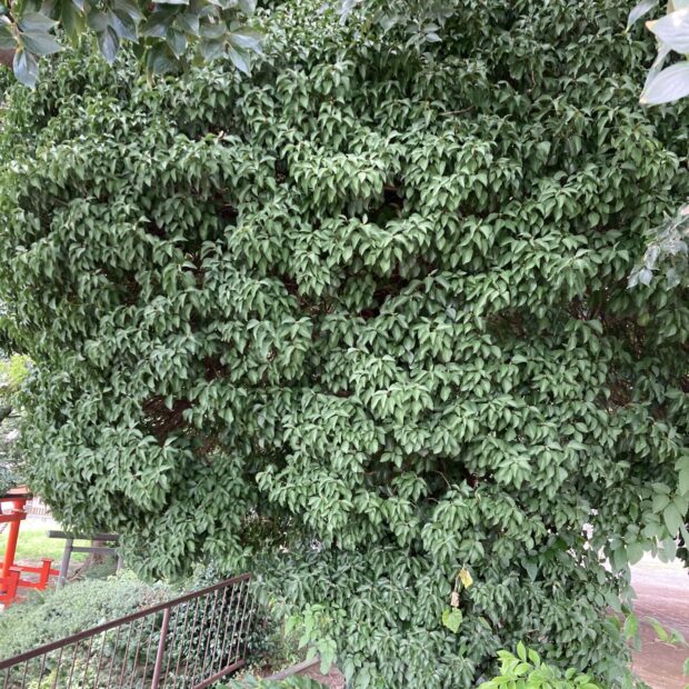 つるで伸びていくので、 場所によってスタイルが違います。 他の木の幹や壁にピタッと張り付いていることもあれば、 そこから分かれた枝をたくさん垂らしてサワサワと風になびいていることもあります。