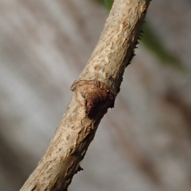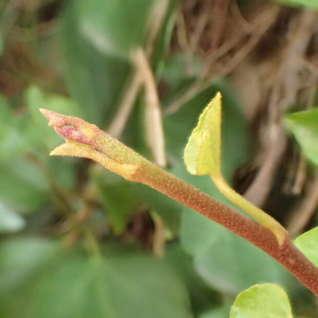 冬芽に芽鱗はなく、 小さな葉がしまわれている形です。 ぐんぐん伸びている枝先からは、 新しい葉が出てきているのがわかります。 ゆっくり伸びている枝先、 枝先より下の芽は少し違う形で出番を待ちます。