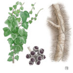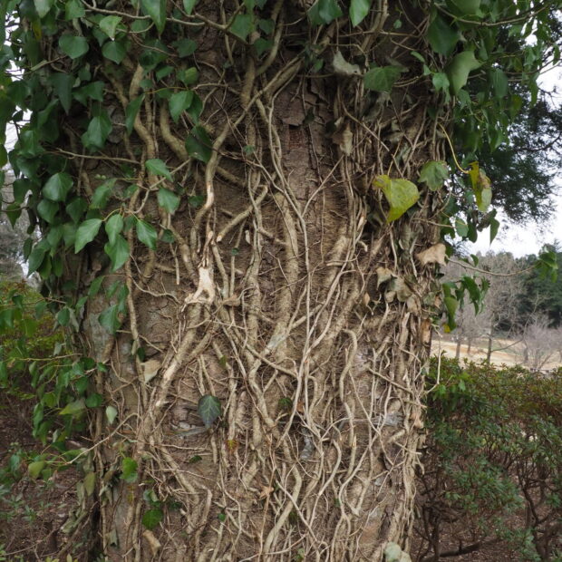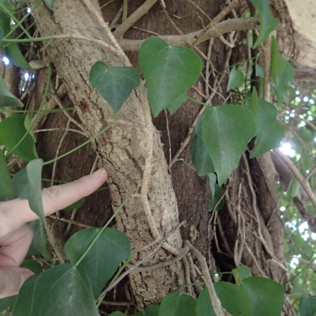 一年中緑色の葉がある常緑のつる性植物で、 「フユヅタ」とも呼ばれます。 幹や枝の途中から気根(きこん)と呼ばれる根を出して他の木や岩や壁にくっついたり、 地面をはったりしながら伸びて大きくなります。