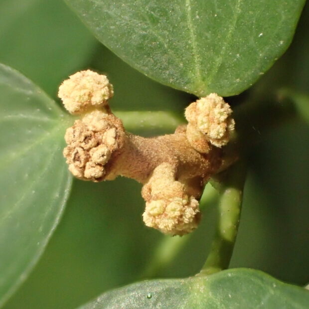 丸いつぼみから最初に咲くのは雄花です。 雄しべがとれると、 真ん中から雌しべが伸びてきて雌花になります。